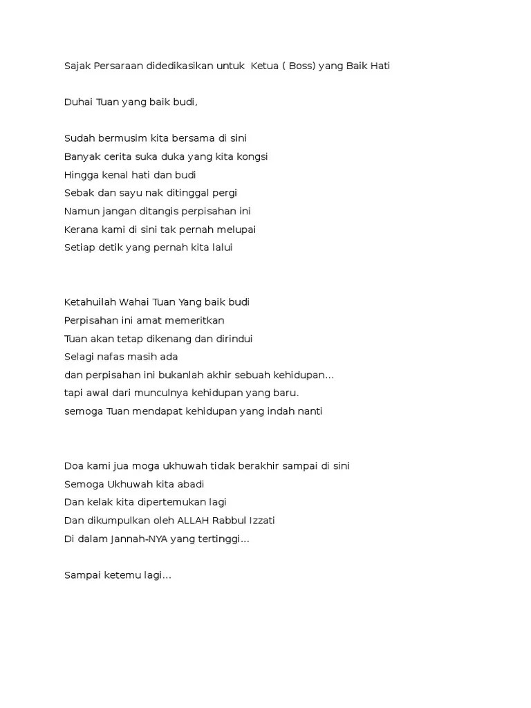 ٢٦ ربيع الآخر ١٤٤٢ هـ. Untuk memudahkan anda artikel ini menyajikan lima belas inspirasi ucapan perpisahan untuk . Membuang segala kerikil bersalut di hati,. Tiba waktunya untuk menyusun jemari,. Sajak untuk majlis perpisahan pengetua/guru besar. Selamat bersara cikgu ahmad kamil dan cikgu syikin. Tiba waktunya untuk menyusun jemari,.